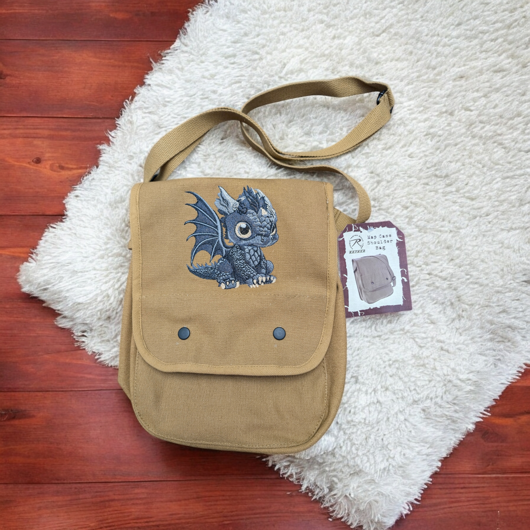 $65.00Carry a touch of magic with the Rothco Canvas Map Case Shoulder Bag, featuring a charming embroidered “Baby Dragon.” Made from durable canvas, this bag offers secure zippered pockets, an adjustable shoulder strap, and a convenient top handle—perfect for everyday adventures with a playful, mythical twist!
